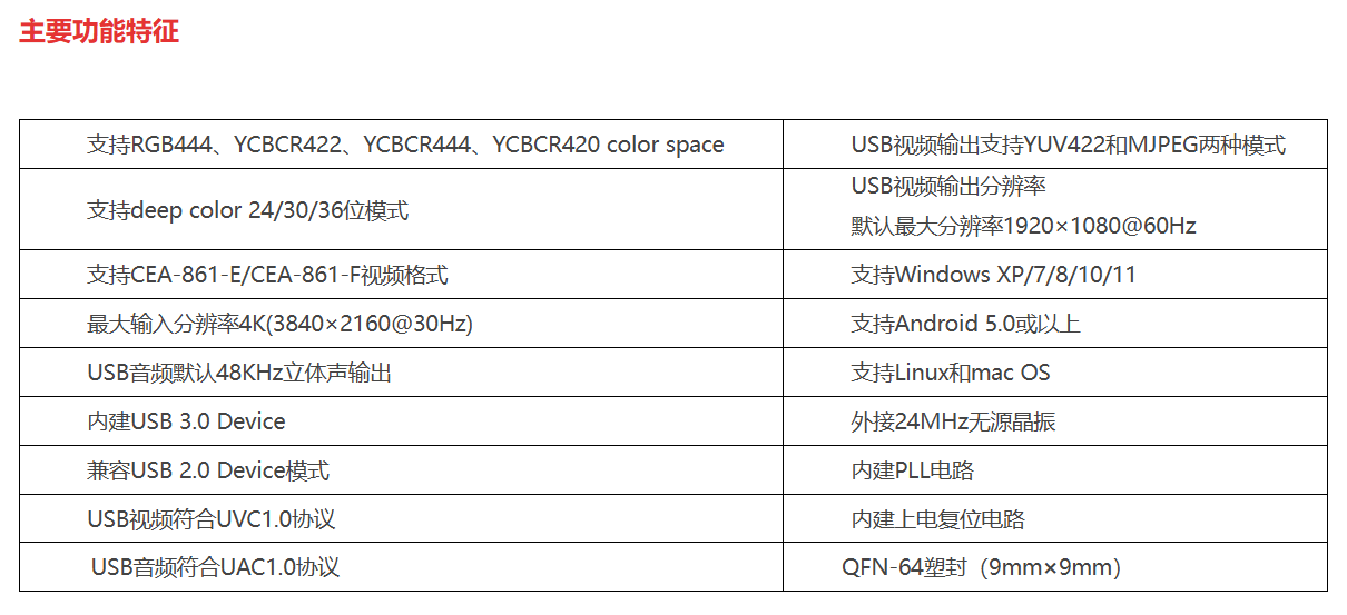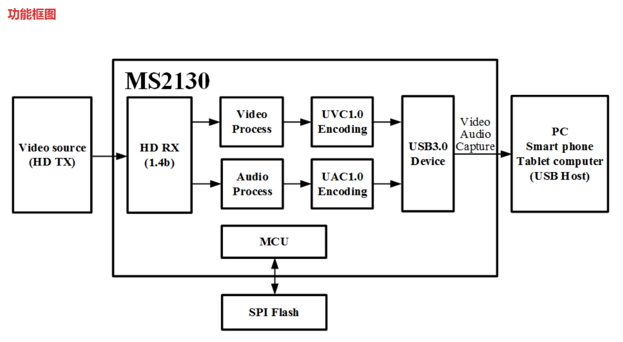 MS2130 is a USB 3.0 high-definition video and audio capture chip. It integrates a USB 3.0 Device controller, a data transceiver module, and an audio and video processing module internally. The MS2130 can transmit HD input audio and video signals to a PC, smart phone or tablet via the USB 3.0 interface for preview or collection. The MS2130 output supports two modes: YUV422 and MIPEG, and is compatible with Windows, Android and macOS systems.