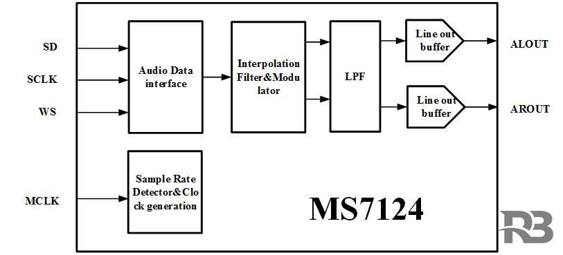 MS7124是一款高性能24bit數(shù)字立體聲音頻DAC,該DAC采用Sigma-Delta結(jié)構(gòu),支持標(biāo)準(zhǔn)的I2S數(shù)字信號(hào)輸入,輸出支持立體聲和單聲道。