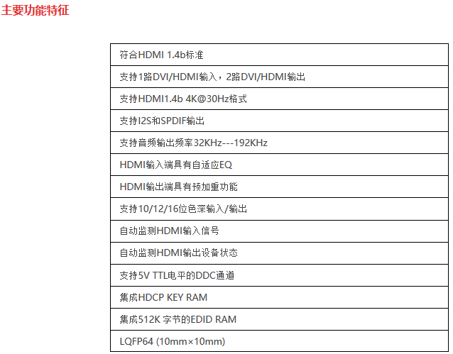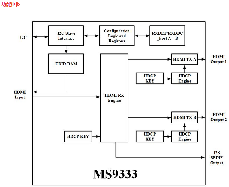 MS9333是一款最高信號(hào)速率可達(dá)3Gbps的HD信號(hào)1分2分配器芯片,同時(shí)支持I2S和SPDIF輸出。在3Gbps的速率下,MS9333可以支持4K@30Hz分辨率的HD輸入信號(hào)。同時(shí)可以支持10/12/16位的色深。HD輸入端的時(shí)鐘與數(shù)據(jù)恢復(fù)功能可以自適應(yīng)不同長度不同質(zhì)量的線材,使得在高速率下傳輸?shù)腡MDS信號(hào)始終具有最佳性能。HD輸出端具有信號(hào)預(yù)加重功能,可以支持長線傳輸。MS9333集成內(nèi)部EDID RAM和HDCP KEY RAM。